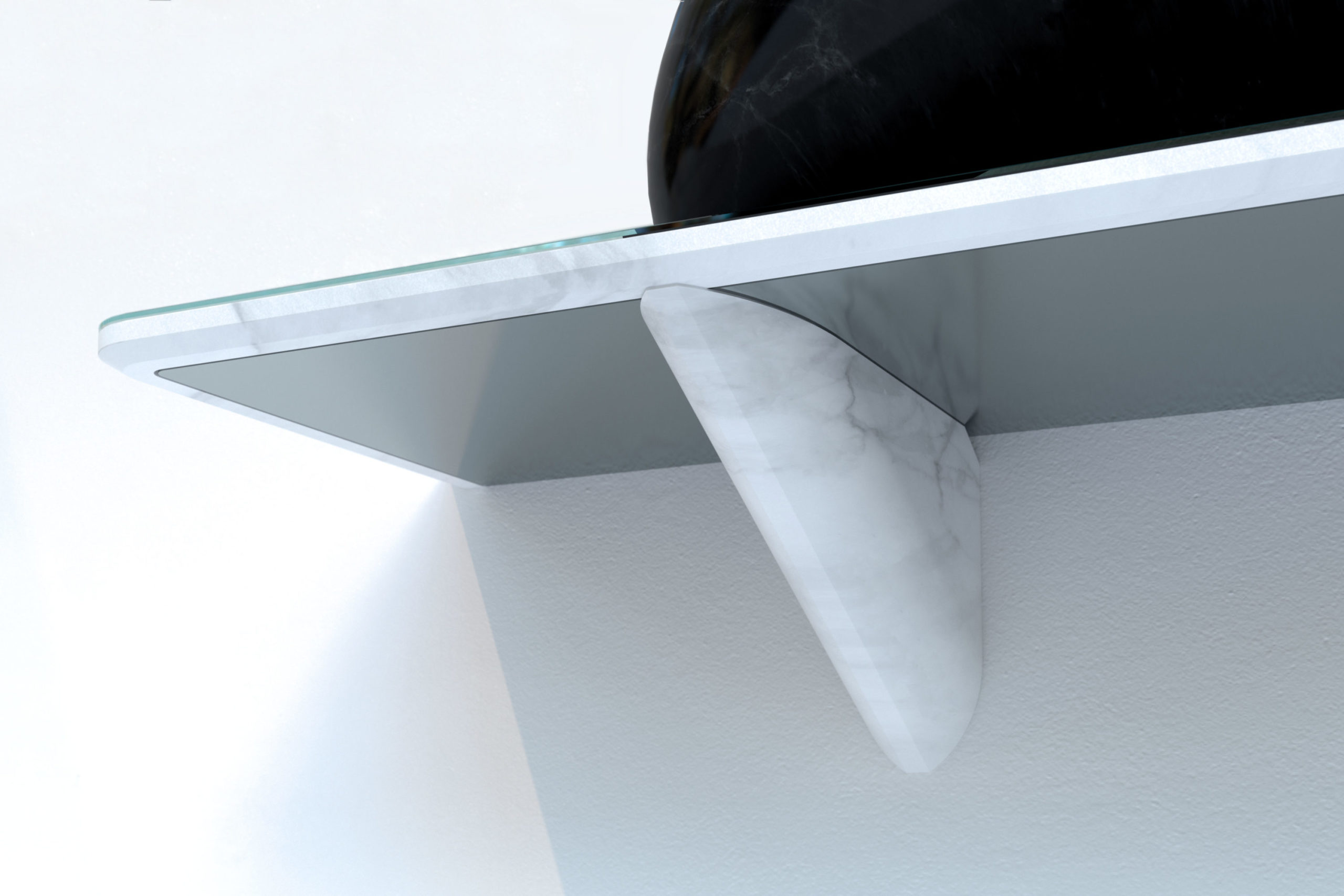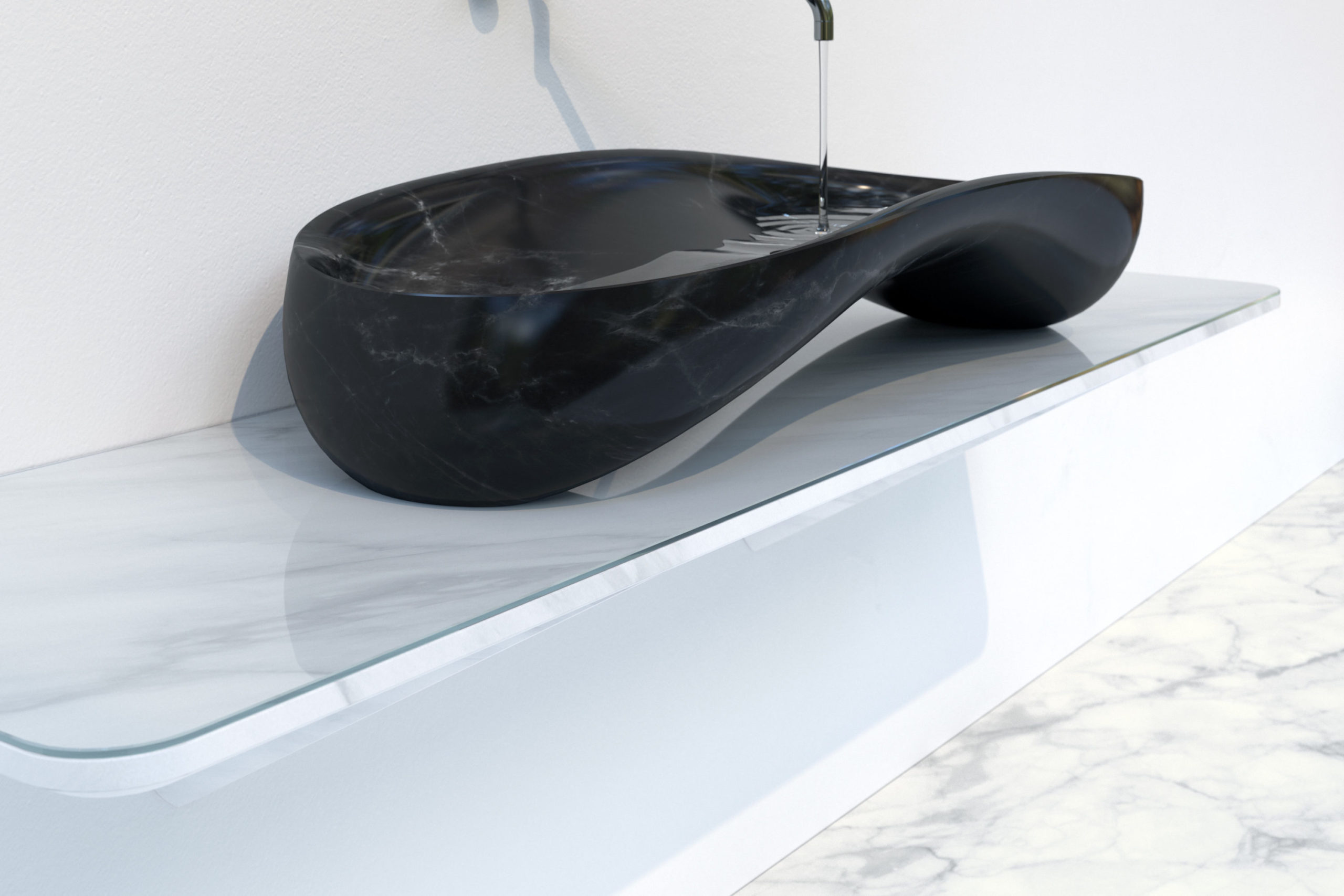 Bridge Bridge The unusual shape of the washbasin allows for two people to use it simultaneously. The water is stored on one side and flows into the other as soon as the basin is filled. The water flows over the “bridge”. The liquid is directed through the two delicate standing surfaces, which give the basin a floating appearance. The finely designed outlet of the water creates the impression of the water vanishing. A core of stainless steel allows the natural stone to be very filigree, but at the same time ensures a firm hold on the wall. The siphons are concealed by discreet covers made of natural stone. These can be easily removed and attached by magnetic force.
